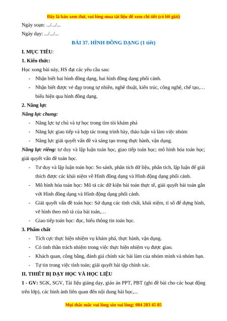 BÀI 37. HÌNH ĐỒNG DẠNG (1 tiết) I. MỤC TIÊU: