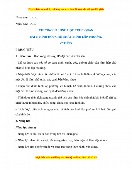 BÀI 1: HÌNH HỘP CHỮ NHẬT. HÌNH LẬP PHƯƠNG (2 TIẾT) I. MỤC TIÊU: