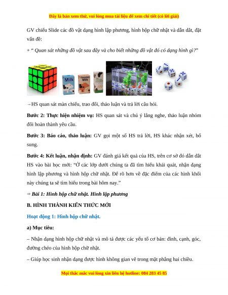 c) Sản phẩm: HS nhận dạng được các đồ vật hình lập phương, các đồ vật dạng