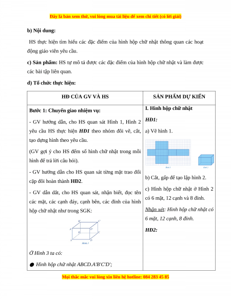 c) Sản phẩm: HS tự mô tả được các đặc điểm của hình hộp chữ nhật và làm được