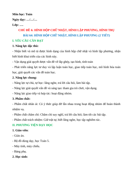 Giáo án Hình hộp chữ nhật, hình lập phương Toán lớp 5 Chân trời sáng tạo