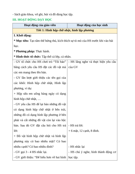 - Nhận biết và mô tả được hình dạng của hình hộp chữ nhật và hình lập phương, nhận