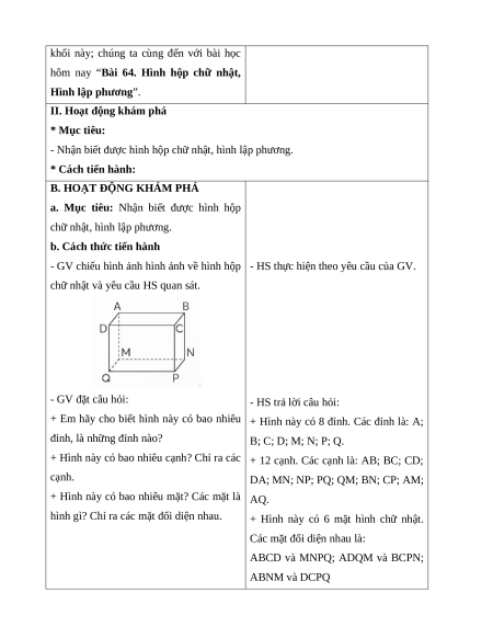 BÀI 64: HÌNH HỘP CHỮ NHẬT, HÌNH LẬP PHƯƠNG (2 TIẾT)