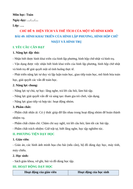 BÀI 49: HÌNH KHAI TRIỂN CỦA HÌNH LẬP PHƯƠNG, HÌNH HỘP CHỮ NHẬT VÀ HÌNH TRỤ
