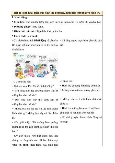 Tiết 1: Hình khai triển của hình lập phương, hình hộp chữ nhật và hình trụ I. Khởi động: