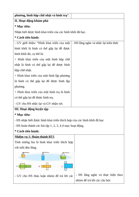 - HS nhận biết được hình khai triển thích hợp của các hình khối đã học