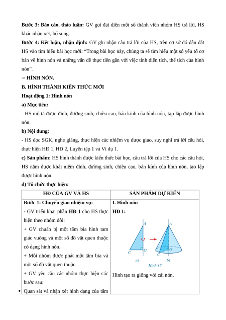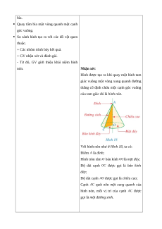 - HS mô tả được đỉnh, đường sinh, chiều cao, bán kính của hình nón, tạp lập được hình nón. b) Nội dung: