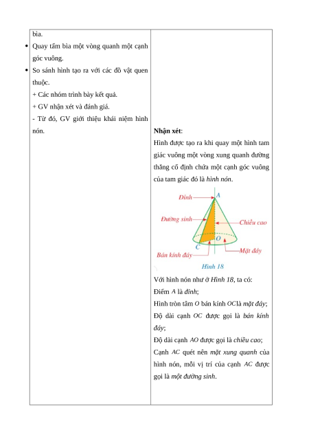 - Từ đó, GV giới thiệu khái niệm hình nón. Nhận xét: