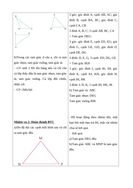 - HS gọi tên các đỉnh, các cạnh, các góc của tam giác: