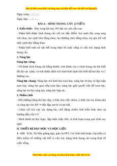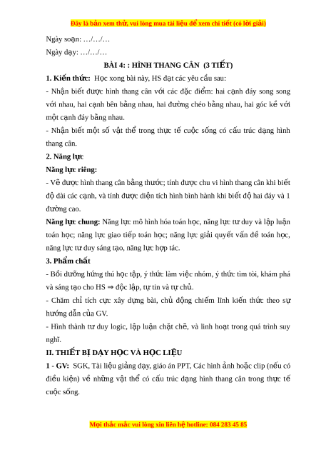 BÀI 4: : HÌNH THANG CÂN (3 TIẾT) 1. Ki n t ế h c ứ : H c ọ xong bài này, HS đ t ạ các yêu c u s ầ au: - Nh n ậ bi t ế đư c ợ hình thang cân v i ớ các đ c ặ đi m ể : hai c nh ạ đáy song song v i ớ nhau, hai c nh ạ bên b ng ằ nhau, hai đư ng ờ chéo b ng ằ nhau, hai góc kề v i ớ m t ộ c nh ạ đáy b ng nhau. ằ - Nh n ậ bi t ế m t ộ số v t ậ thể trong th c ự tế cu c ộ s ng ố có c u ấ trúc d ng ạ hình thang cân. 2. Năng l c ự Năng l c ự riêng: - Vẽ đư c hì ợ nh thang cân b ng t ằ hư c;