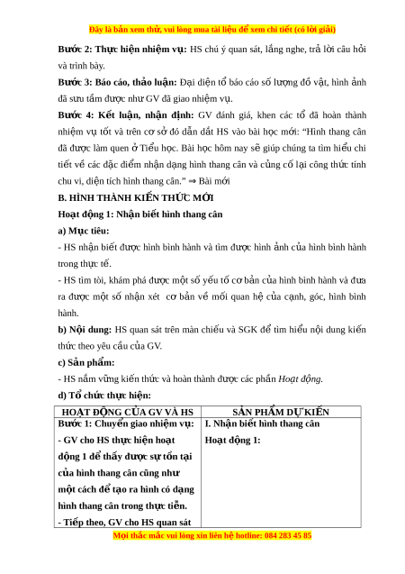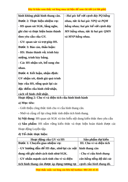 ệ tích hình bình hành khi bi t ế đ ộ hai đáy và 1 đư ng cao. ờ Năng l c ự chung: Năng l c ự mô hình hóa toán h c, ọ năng l c ự t ư duy và l p ậ lu n ậ toán h c; ọ năng l c ự giao ti p ế toán h c; ọ năng l c ự gi i ả quy t ế v n ấ đề toán h c, ọ năng l c t ự duy s ư áng t o, năng ạ l c h ự p t ợ ác. 3. Ph m ẩ chất - Bồi dư ng ỡ h ng t ứ hú h c t ọ p, ậ ý th c l ứ àm vi c nhóm ệ , ý th c t ứ ìm tòi, khám phá và sáng t o cho H ạ S ⇒ đ c l ộ p, ậ t t ự in và t ch ự . ủ - Chăm chỉ tích c c ự xây d ng ự bài, chủ đ ng ộ chi m ế lĩnh ki n ế th c ứ theo sự hư ng d ớ ẫn c a G ủ V.