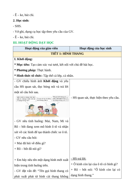 - Vở ghi, dụng cụ học tập theo yêu cầu của GV. - Ê – ke, bút chì.