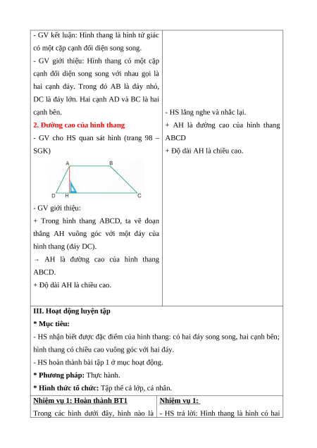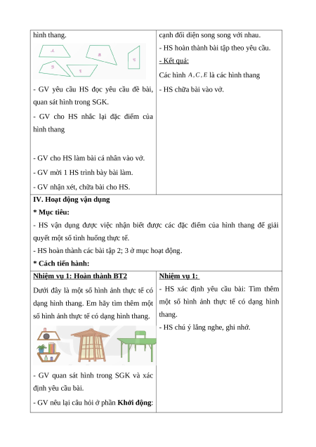 - HS nhận biết được đặc điểm của hình thang: có hai đáy song song, hai cạnh bên;