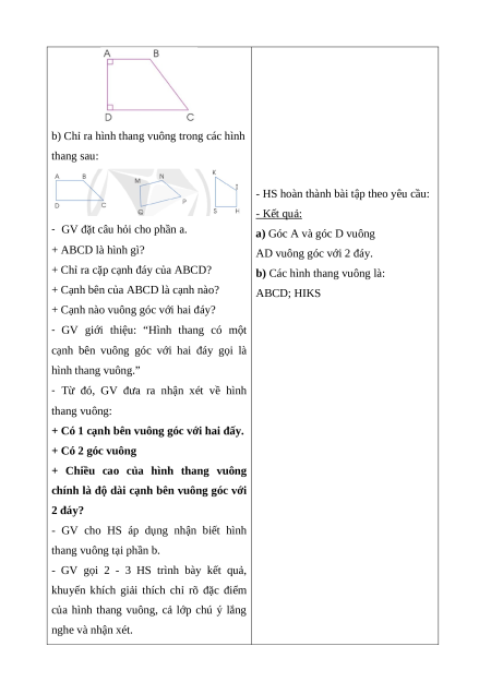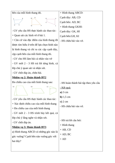 bên của mỗi hình thang đó. + Hình thang ABCD: Cạnh đáy: AB, CD Cạnh bên: AD; BC + Hình thang GKHI: