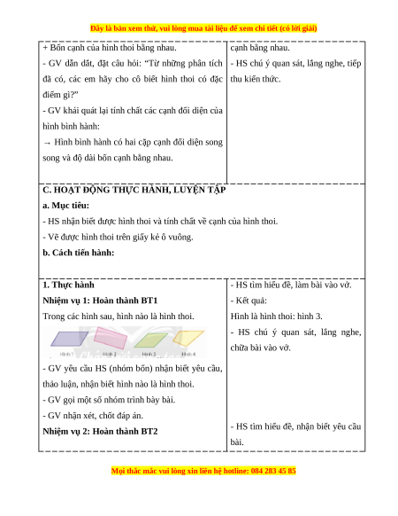 - HS nhận biết được hình thoi và tính chất về cạnh của hình thoi; vẽ được hình thoi trên giấy kẻ ô vuông.