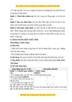 góc là góc vuông, hai đư ng ờ chéo b ng ằ nhau); l c ụ giác đ u ề 9 sáu c nh ạ b ng ằ nhau, sáu góc b ng nahu, ba ằ đư ng chéo chí ờ nh b ng ằ nhau). 2. Năng l c ự - Năng l c ri ự êng: + Vẽ đư c hì ợ nh tam giác đ u, ề hình vuông b ng d ằ ng c ụ ụ h c t ọ p. ậ + T o ạ l p ậ đư c ợ hình l c ụ giác đ u ề thông qua vi c ệ l p ắ ghép các hình tam giác đ u. ề - Năng l c ự chung: Năng l c ự tư duy và l p ậ lu n ậ toán h c; ọ năng l c ự mô hình hóa toán h c; ọ s d ử ng công c ụ , ụ phư ng t ơ i n h ệ c t ọ oán. 3. Ph m ẩ chất - Phẩm ch t ấ : Bồi dư ng h ỡ ng t ứ hú h c ọ t p, ý t ậ h c l ứ àm vi c nhóm ệ , ý th c t ứ ìm
