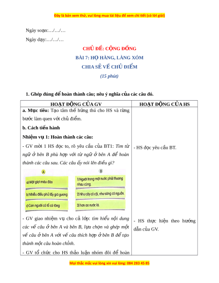 Ngày so n ạ :…/…/… Ngày d y ạ :…/…/… CHỦ Đ : Ề CỘNG Đ N Ồ G BÀI 7: H Ọ HÀNG, LÀNG XÓM CHIA S Ẻ VỀ CHỦ ĐI M Ể (15 phút) 1. Ghép đúng đ