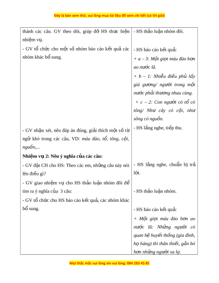 ặ CH cho HS: Theo các em, nh n ữ g câu này nói - HS l n ắ g nghe, chu n ẩ bị trả lên đi u ề gì? l i ờ . - GV giao nhi m ệ vụ cho HS th o ả lu n ậ nhóm đôi để tìm ra ý nghĩa c a ủ 3 câu: - HS th o ả lu n ậ nhóm. - GV tổ ch c ứ cho HS báo cáo k t ế qu , ả các nhóm khác bổ sung. - HS báo cáo k t ế qu : ả + M t ộ gi t ọ máu đào h n ơ ao n c ướ lã: Nh n ữ g ng i ườ có quan h ệ huy t ế th n ố g (gia đình,