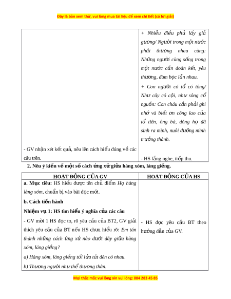 ữ hàng xóm, láng gi ng ề . HO T Ạ ĐỘNG C A Ủ GV HO T Ạ ĐỘNG C A Ủ HS a. M c ụ tiêu: HS hi u ể đ c ượ tên chủ đi m ể Họ hàng làng xóm, chu n ẩ b ịvào bài đ c ọ m i ớ . b. Cách ti n ế hành Nhiệm v ụ 1: HS tìm hi u ể ý nghĩa c a ủ các câu - GV m i ờ 1 HS đ c ọ to, rõ yêu c u ầ c a ủ BT2, GV gi i ả - HS đ c ọ yêu c u ầ BT theo thích yêu c u ầ c a ủ BT n u ế HS ch a ư hi u ể rõ: Em tán h n ướ g d n ẫ c a ủ GV. thành nh n ữ g cách n ứ g xử nào d i ướ đây gi a ữ hàng xóm, láng gi n ề g?