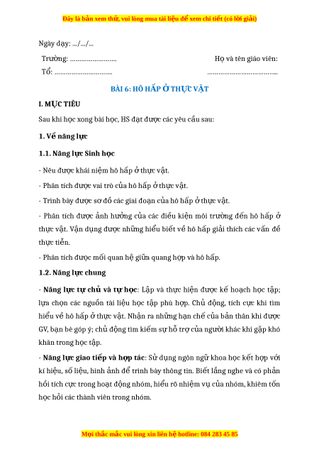 ………………………………. BÀI 6: HÔ H P Ấ T Ở H C Ự V T Ậ I. M C Ụ TIÊU Sau khi h c ọ xong bài h c ọ , HS đ t ạ đư c ợ các yêu c u ầ sau: 1. V n ề ăng l c ự 1.1. Năng l c ự Sinh h c ọ - Nêu đư c ợ khái ni m ệ hô h p ấ t ở h c ự v t ậ . - Phân tích đư c ợ vai trò c a ủ hô h p ấ t ở h c ự v t ậ . - Trình bày đư c ợ s ơ đ c ồ ác giai đo n ạ c a ủ hô h p ấ t ở h c ự v t ậ . - Phân tích đư c ợ n ả h hư n ở g c a ủ các đi u ề ki n ệ môi trư n ờ g đ n ế hô h p ấ ở th c ự v t ậ . V n ậ d n ụ g đư c ợ nh n ữ g hi u ể bi t ế v ề hô h p ấ gi i ả thích các v n ấ đề th c ự ti n ễ . - Phân tích đư c ọ m i q ố uan h g ệ i a ữ quang h p v ợ à hô h p. ấ 1.2. Năng l c ự chung - Năng l c