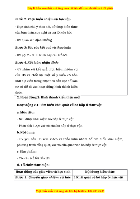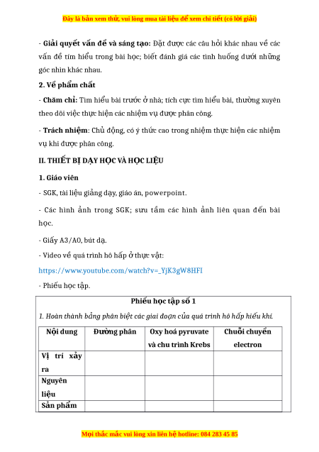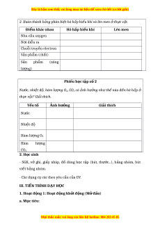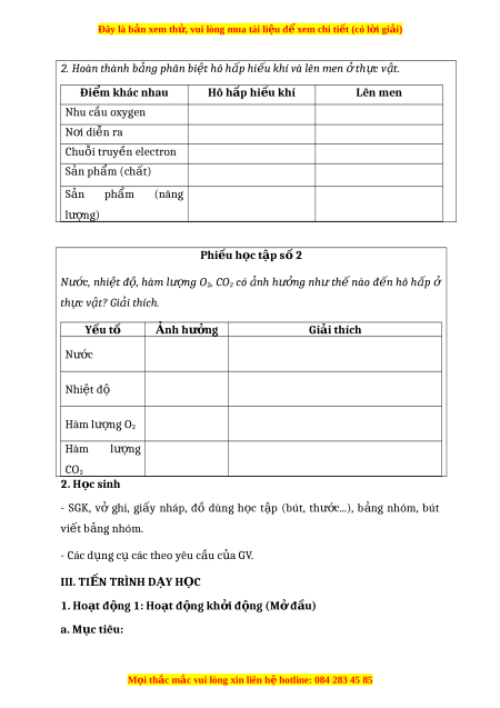 Đây là bản xem th , vu ử i lòng mua tài li u ệ đ xe ể m chi ti t ế (có l i ờ gi i ả ) 2. Hoàn thành b ng ả phân bi t ệ hô h p ấ hi u k ế hí và lên men t ở h c ự v t ậ . Đi m ể khác nhau Hô h p ấ hi u ế khí Lên men Nhu c u ầ oxygen N i ơ di n ễ ra Chuỗi truy n ề electron S n ả ph m ẩ (ch t ấ ) S n ả ph m ẩ (năng lư n ợ g) Phi u ế h c ọ t p ậ s 2 ố Nư c ơ , nhi t ệ đ , ô hàm lư ng ơ O2, CO2 co nh ả hư ng ở như th ế nào đ n ế hô h p ấ ở th c ự v t ậ ? Gi i ả thích. Y u ế tố Anh hư n ơ g Giải thích Nư c ớ Nhiệt độ Hàm lư n ợ g O2 Hàm lư n ợ g CO2 2. H c ọ sinh - SGK, vở ghi, gi y ấ nháp, đồ dùng h c ọ t p ậ (bút, thư c ớ . .), b n ả g nhóm, bút vi t ế b n ả g nhóm. - Các d n ụ g c c ụ ác theo yêu c u ầ c a ủ GV. III. TI N T Ế RÌNH D Y Ạ H C Ọ 1. Ho t ạ đ n ộ g 1: Ho t ạ đ n ộ g kh i ơ đ n ộ g (M đ ơ u ầ ) a. M c ụ tiêu: M i ọ thắc m c