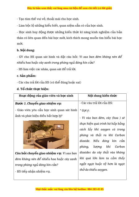 ặ cây xanh trong phòng ng đ ủ ong kín c a ử ? - HS làm vi c ệ các nhân, quan sát đ t ể r l ả i ờ . c. S n ả ph m ẩ : - Các câu tr l ả i c ờ a ủ HS (có th ể đúng ho c ặ sai) d. T c ổ h c ứ th c ự hi n ệ : Hoạt đ n ộ g c a giáo ủ viên và h c ọ sinh N i d ộ ung ki n ế th c ứ Bư c ớ 1. Chuy n ể giao nhi m ệ v : ụ - Các câu tr l ả i c ờ a ủ HS: - Giáo viên yêu c u ầ h c