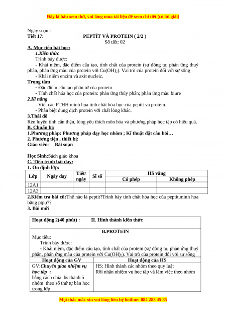 Tiết 17: PEPTÍT VÀ PROTEIN ( 2/2 ) Số tiết: 02 A.