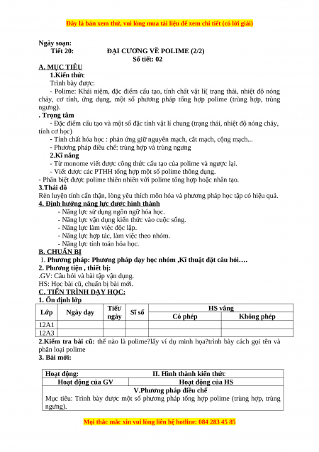 Tiết 20: ĐẠI CƯƠNG VỀ POLIME (2/2) Số tiết: 02 A . M ỤC TIÊU 1.Kiến thức Trình bày được: