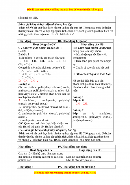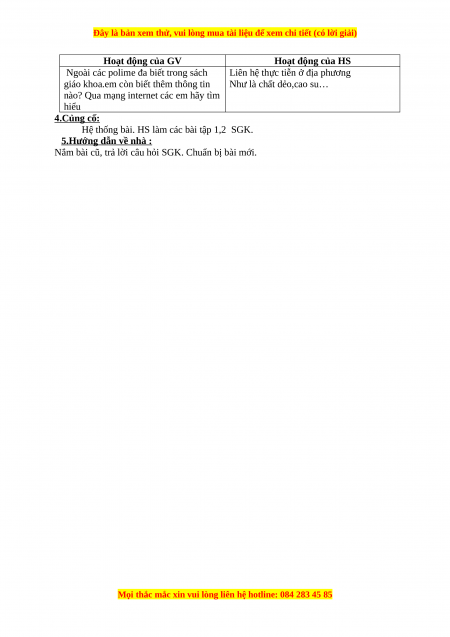 2.Kiểm tra bài cũ: thế nào là polime?lấy ví dụ minh họa?trình bày cách gọi tên và phân loại polime 3. Bài mới: Hoạt động: