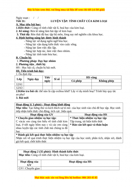 Giáo án Hóa 12 học kì I Tiết 31: Luyện tập: Tính chất của kim loại