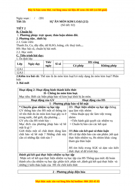 Tiết 33: SỰ ĂN MÒN KIM LOẠI (2/2) (Số tiết: 02) TIẾT 2 B . Chuẩn bị: