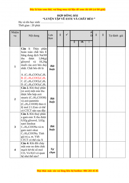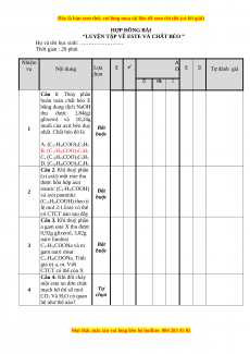Họ và tên học sinh: …………………… Thời gian : 20 phút Nhiệm A. vụ Nội dung Lựa Đ Tự đánh giá chọn Câu 1: Thủy phân hoàn toàn chất béo E bằng dung dịch NaOH thu được 1,84(g) glixerol và 18,24g muối của axit béo duy 1 Bắt nhất. Chất béo đó là buộc A. (C17H33COO)3C3H5 B. (C17H35COO)3C3H5 C. (C15H31COO)3C3H5 D. (C15H29COO)3C3H5