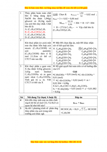 Câu 2. Khi thuỷ phân (xt axit) một este thu được hỗn hợp axit stearic (C 2 17H35COOH) Bắt và axit panmitic buộc (C15H31COOH) theo tỉ lệ mol 2:1.Este có thể có CTCT nào sau đây