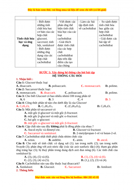 độ tan), tính chất hóa học của saccarozơ, tinh bột và xenlulozơ (thủy phân trong môi trường axit),