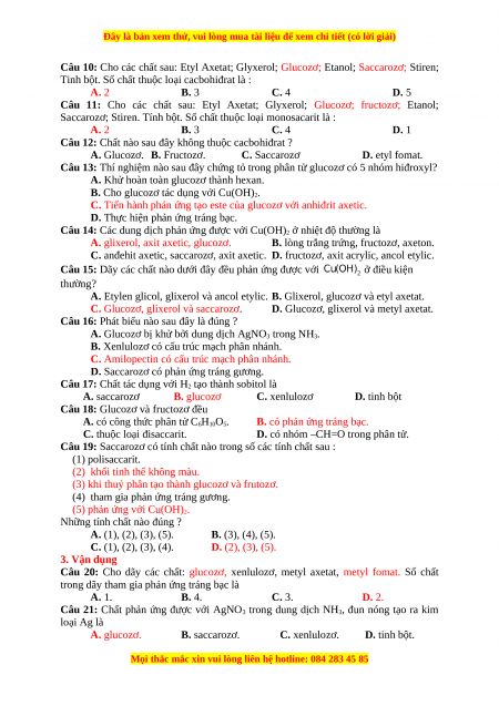 Câu 10: Cho các chất sau: Etyl Axetat; Glyxerol; Glucozơ; Etanol; Saccarozơ; Stiren;