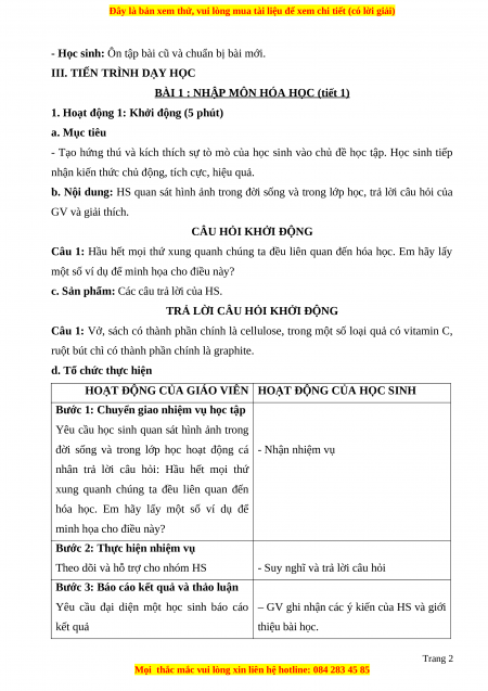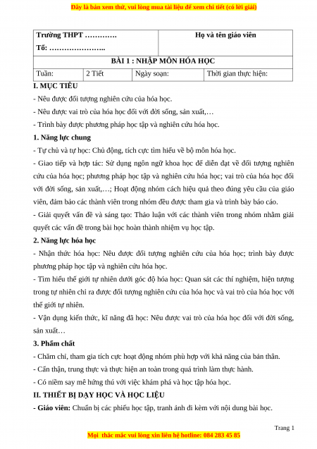 BÀI 1 : NHẬP MÔN HÓA HỌC Tuần: 2 Tiết Ngày soạn: Thời gian thực hiện: I. MỤC TIÊU