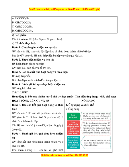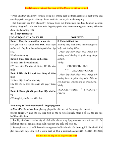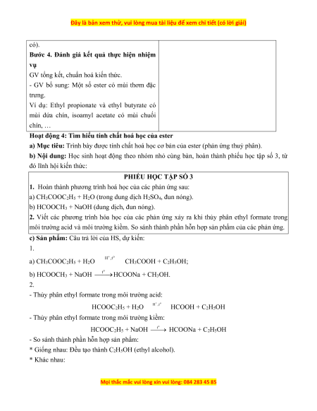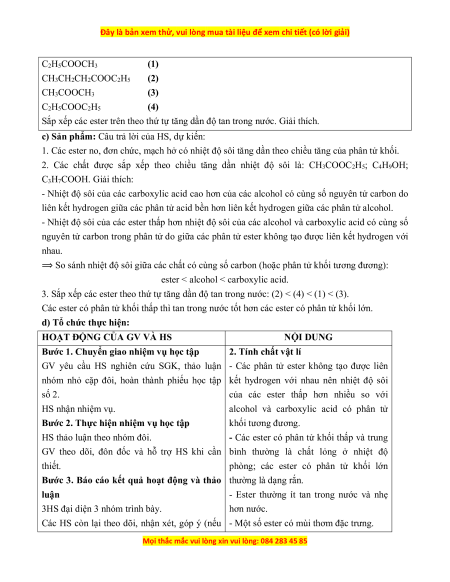 + Trình bày được đặc điểm về tính chất vật lí và tính chất hoá học cơ bản của ester (phản ứng
