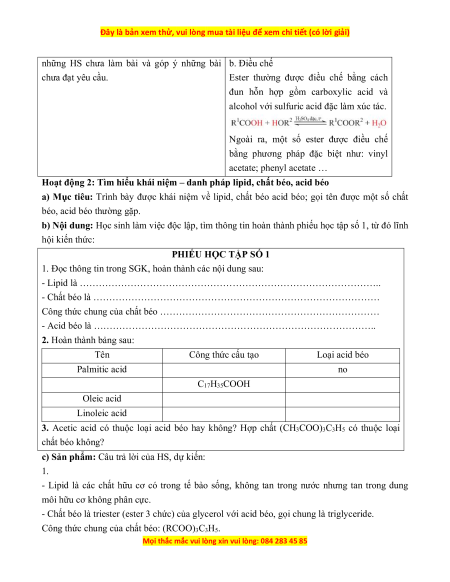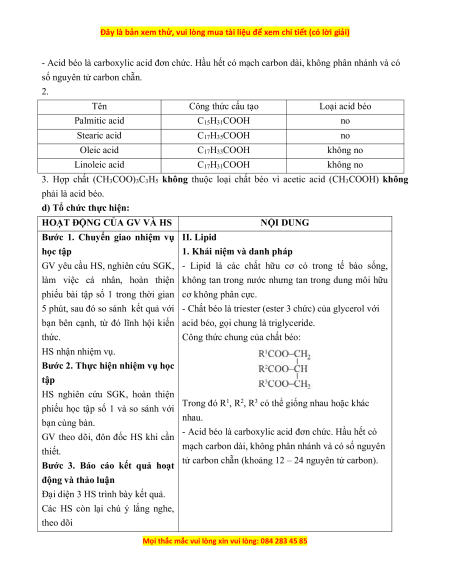 + Nêu được khái niệm về lipid, chất béo, acid béo, đặc điểm cấu tạo phân tử ester.