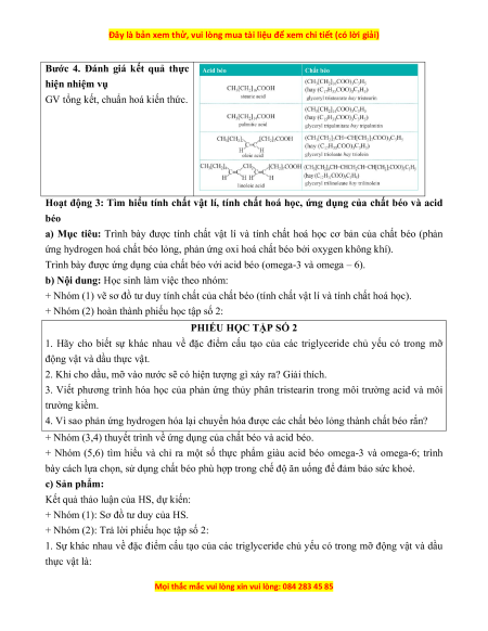 - Năng lực vận dụng kiến thức, kỹ năng đã học: Trình bày được ứng dụng của chất béo và acid