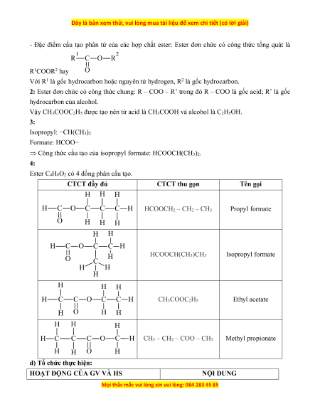 Ester C4H8O2 có 4 đồng phân cấu tạo. CTCT đầy đủ CTCT thu gọn Tên gọi HCOOCH2 – CH2 – CH3 Propyl formate HCOOCH(CH3)CH3 Isopropyl formate CH3COOC2H5 Ethyl acetate CH3 – CH2 – COO – CH3 Methyl propionate