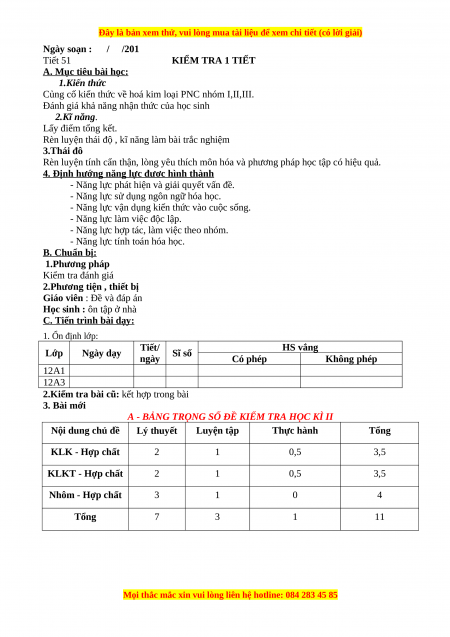 A - BẢNG TRỌNG SỐ ĐỀ KIỂM TRA HỌC KÌ II Nội dung chủ đề Lý thuyết Luyện tập Thực hành Tổng KLK - Hợp chất 2 1 0,5 3,5 KLKT - Hợp chất 2 1 0,5 3,5 Nhôm - Hợp chất 3 1 0 4 Tổng 7 3 1 11