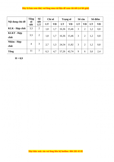 Tổng Số Chỉ số Trọng số Số câu Số điểm Nội dung chủ đề số tiết tiết LT LT VD LT VD LT VD LT VD KLK - Hợp chất 3,5 2 1,8 1,7 16,36 15,46 3 2 1,2 0,8 KLKT - Hợp 3,5 2 1,8 1,7 16,36 15,46 3 2 1,2 0,8 chất Nhôm - Hợp 4 3 2,7 1,3 24,54 11,82 3 2 1,2 0,8 chất Tổng 11 7 6,3 4,7 57,26 42,74 9 6 3,6 2,4 H = 0,9