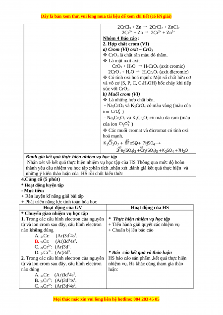 khử, tính lưỡng tính); Tính chất của hợp chất crom (VI), K2CrO4, K2Cr2O7 (tính tan, màu sắc, tính oxi hoá).