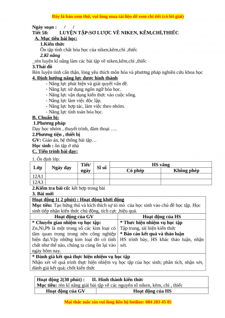 Giáo án Hóa học 12 học kì 2 Tiết 58: Luyện tập: Sơ lược về niken, kẽm, chì, thiếc