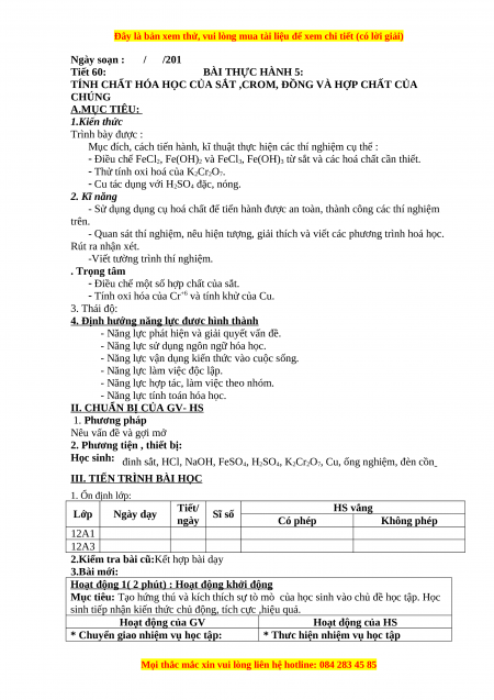Học sinh: đinh sắt, HCl, NaOH, FeSO4, H2SO4, K2Cr2O7, Cu, ống nghiệm, đèn cồn III. TIẾN TRÌNH BÀI HỌC 1. Ổn định lớp: Tiết/ HS vắng Lớp Ngày dạy Sĩ số ngày Có phép Không phép 12A1 12A3
