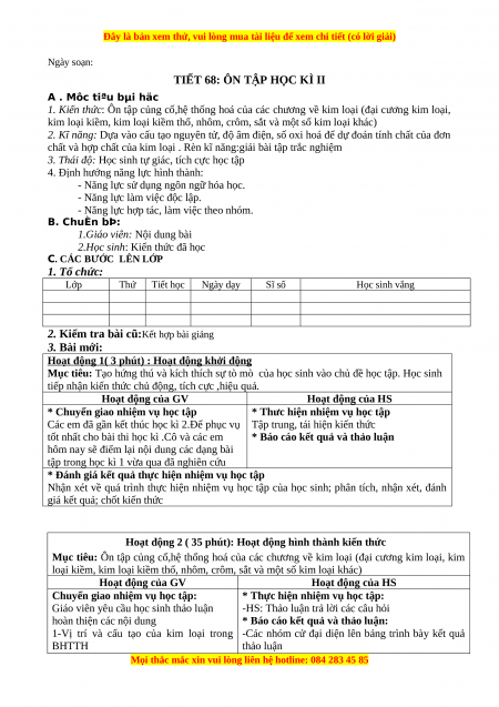 Mục tiêu: Ôn tập củng cố,hệ thống hoá của các chương về kim loại (đại cương kim loại, kim