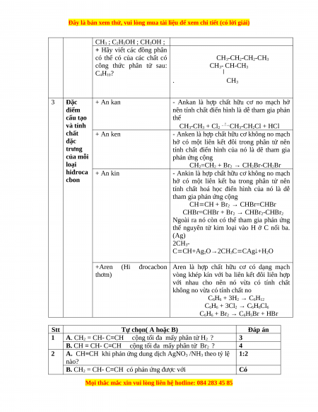 chất có công thức phân tử sau: C4H10? 3 Đặc điểm + An kan cấu tạo và + An ken tính chất + An kin đặc trưng +Aren (Hi đrocacbon thơm) của mỗi loại hiđrocacbon Stt