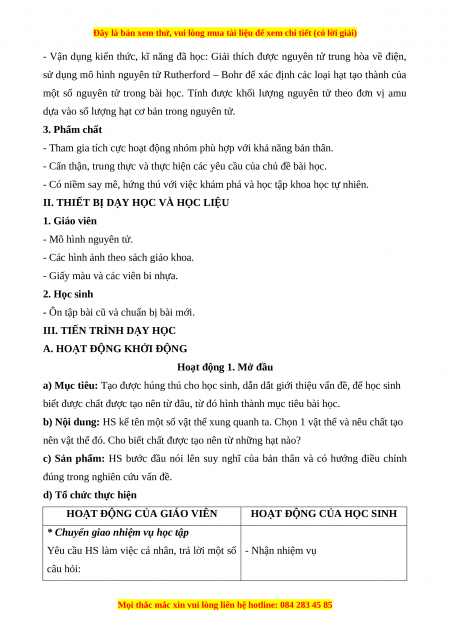 II. THIẾT BỊ DẠY HỌC VÀ HỌC LIỆU 1. Giáo viên - Mô hình nguyên tử.
