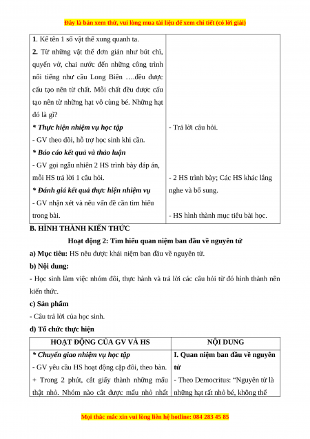 a) Mục tiêu: HS nêu được khái niệm ban đầu về nguyên tử. b) Nội dung: