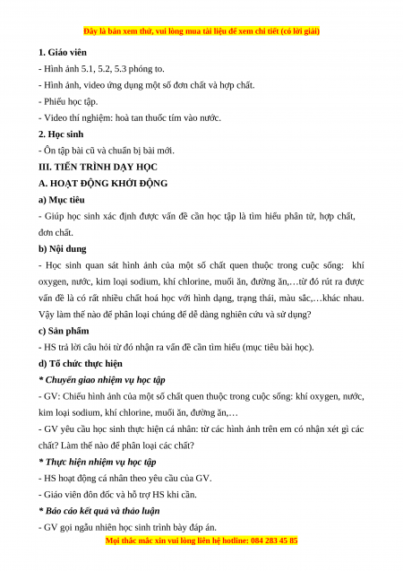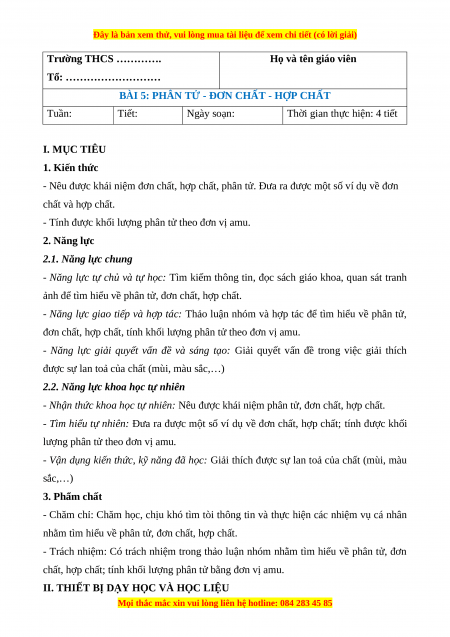 - Nhận thức khoa học tự nhiên: Nêu được khái niệm phân tử, đơn chất, hợp chất.